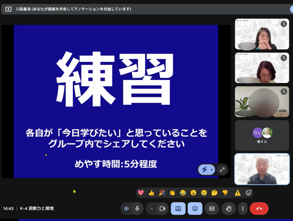 過去の経験や価値観の陳腐化する時代に、上から目線で教えてやるという態度に陥る怖さをより俯瞰的な目線で認識し、フラットな安心感を生む関係構築を築いていきたい。最後の30分のディスカッションは、同じ目的に向かい努力する仲間同士、議論が静かに白熱してとても満足度が高く、また学びが深まりました。