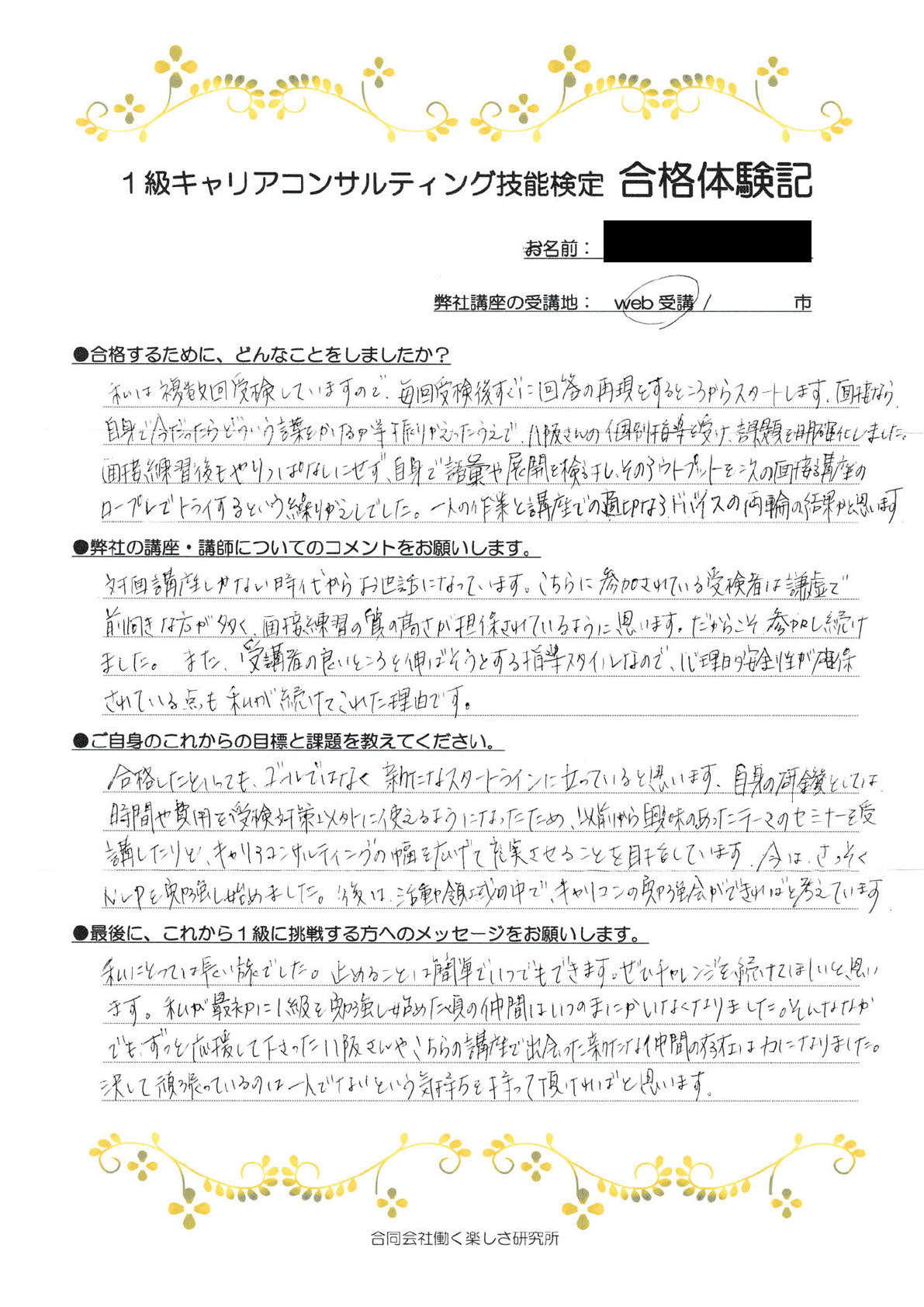 ブログ 2022.04.12 2023.10.27 合格体験記止めることはいつでもできますが、ぜひチャレンジを続けて欲しいです。 執筆者 | 合同会社働く楽しさ研究所 兵庫県・企業領域・第11回合格 「私にとっては長い旅でした。止めることは簡単でいつでもできます。ぜひチャレンジを続けて欲しいと思います。私が最初に1級を勉強し始めたころの仲間はいつのまにかいなくなりました。そんな中でもずっと応援してくださった八阪さんやこちらの講座で出会った新たな仲間の存在は力になりました。決して頑張っているのは一人ではないという気持ちを持っていただければと思います。」 1級CC技能検定対策講座のご案内ページはこちら 一覧へ戻る