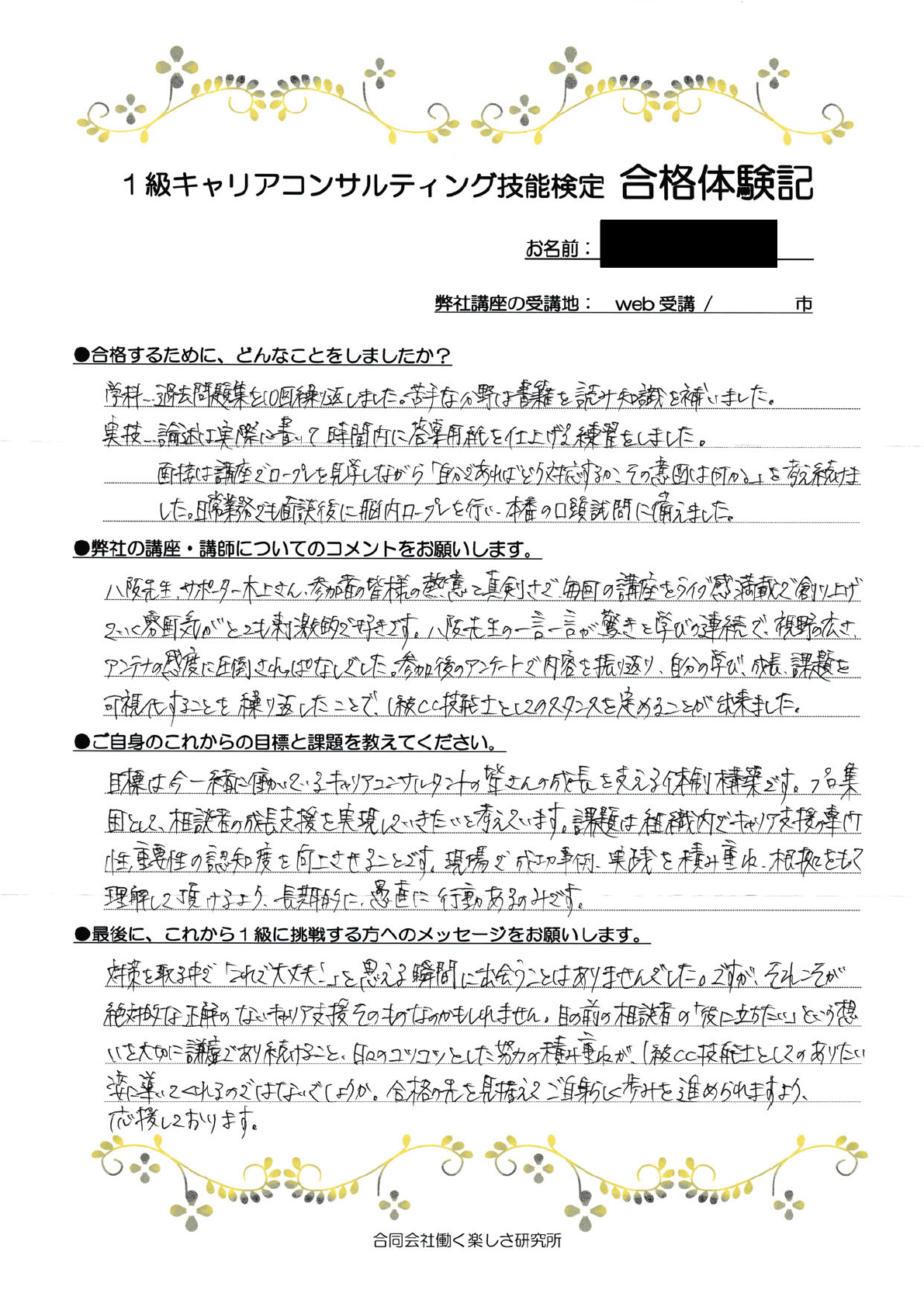 ブログ 2024.04.14 2024.04.19 合格体験記自分の学びや課題を可視化したことで、1級としてのスタンスを定められました。 執筆者 | 合同会社働く楽しさ研究所 埼玉県・教育機関領域・第13回合格 「八阪先生・木上さん・参加者のみなさまの熱意と真剣さで、毎回の講座をライブ感満載で創り上げていく雰囲気がとても刺激的で好きです。八阪先生の一言一言が驚きと学びの連続で、視野の広さ、アンテナの感度に圧倒されました。参加後のアンケートで内容を振り返り、自分の学び・成長・課題を可視化することを繰り返したことで、1級CC技能士としてのスタンスを定めることができました。」 1級CC技能検定対策講座のご案内ページはこちら 一覧へ戻る