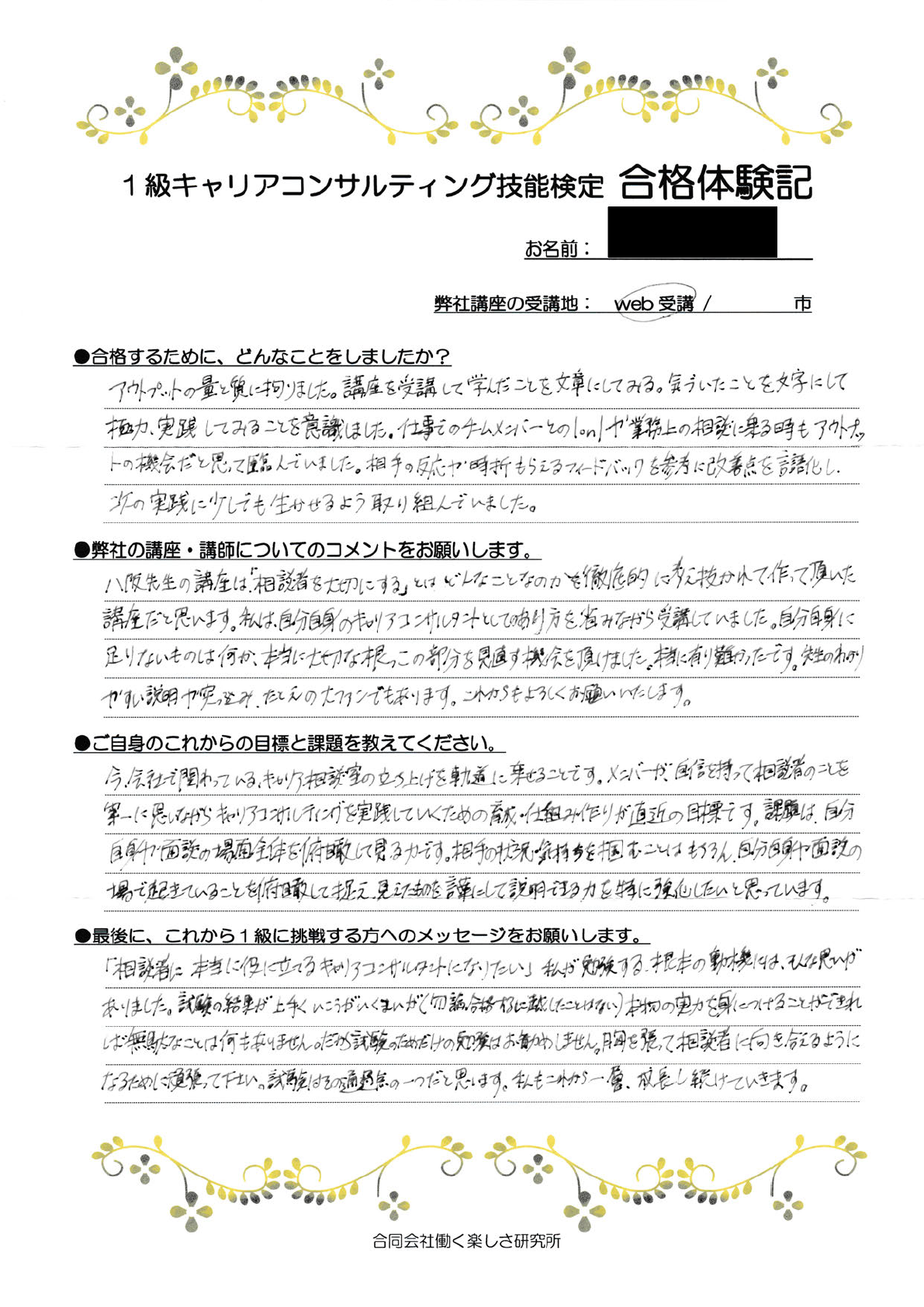 「『相談者に本当に役に立てるキャリアコンサルタントになりたい』わたしが勉強する根本の動機にはそんな思いがありました。試験の結果が上手くいこうがいくまいが(もちろん、合格するに越したことはない)本物の実力を身につけることができれば無駄なことは何もありません。だから試験のためだけの勉強はお勧めしません。胸を張って相談者に向き合えるようになるために頑張ってください。試験はその通過点の一つだと思います。わたしもこれから一層、成長し続けていきます。」