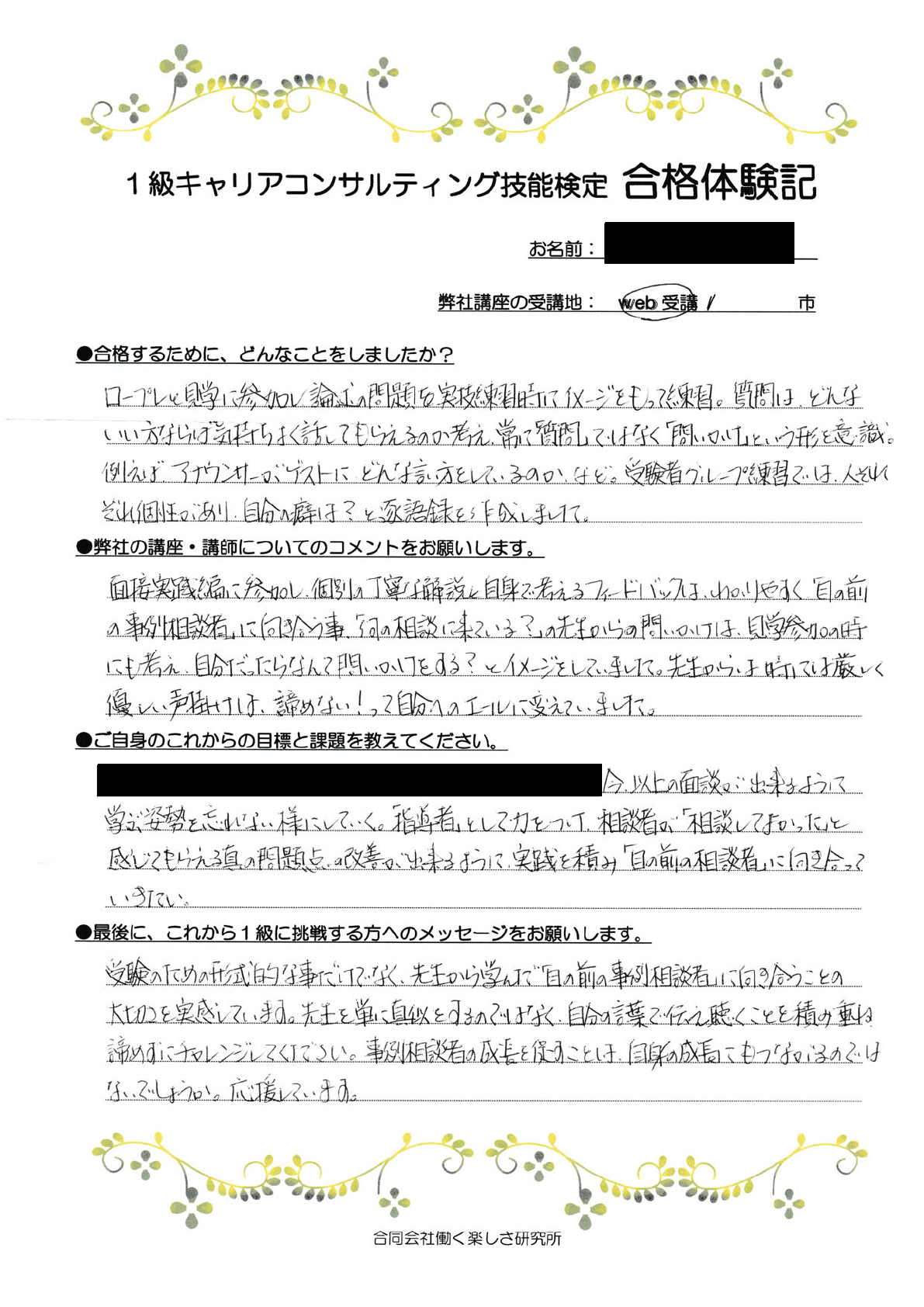 ブログ 2025.06.02 合格体験記『目の前の事例相談者』に向き合う大切さを実感しています。 執筆者 | 合同会社働く楽しさ研究所 静岡県・第14回合格 「受験のための形式的なことだけでなく、先生から学んだ『目の前の事例相談者』に向き合うことの大切さを実感しています。先生を単にマネするのではなく、自分の言葉で伝え聴くことを積み重ね、諦めずにチャレンジしてください。事例相談者の成長を促すことは、自身の成長にもつながるのではないでしょうか。応援しています。」 1級CC技能検定対策講座のご案内ページはこちら 一覧へ戻る