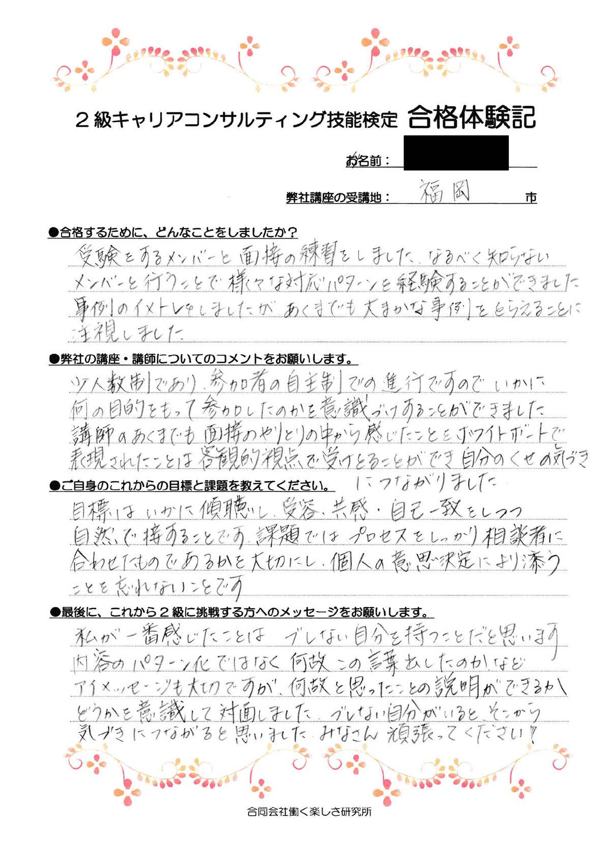 ブログ 2020.07.17 2023.10.23 合格体験記ブレない自分がいると、そこから気付きに繋がると思いました。 執筆者 | 合同会社働く楽しさ研究所 沖縄県・第23回合格 「私が一番感じたことは、ブレない自分を持つことだと思います。内容のパターン化ではなく、何故この言葉を出したのかなど、Iメッセージも大切ですが、何故と思ったことの説明ができるかどうかを意識して対面しました。ブレない自分がいると、そこから気付きに繋がると思いました。みなさん頑張ってください!」 2級CC技能検定対策講座のご案内ページはこちら 一覧へ戻る