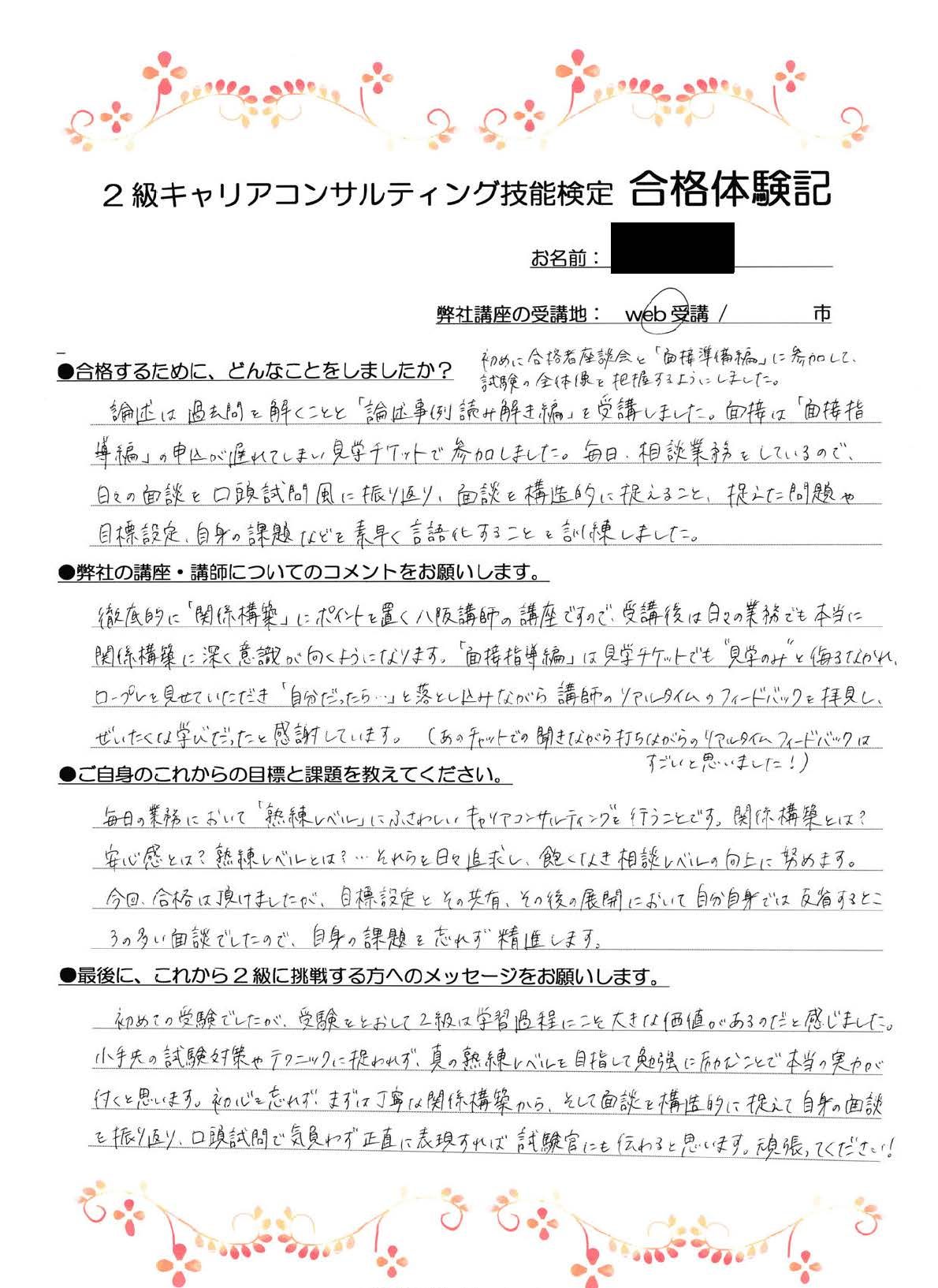 ブログ 2022.10.02 2023.10.27 合格体験記小手先の試験対策に囚われず、真の熟練レベルを目指して。 執筆者 | 合同会社働く楽しさ研究所 福岡県・企業領域・第28回合格 「初めての受検でしたが、受検をとおして2級は学習過程にこそ大きな価値があるのだと感じました。小手先の試験対策やテクニックに囚われず、真の熟練レベルを目指して勉強に励むことで本当の実力が付くと思います。初心を忘れず、まずは丁寧な関係構築から、そして面談を構造的に捉えて自身の面談を振り返り、口頭試問で気負わず正直に表現すれば、試験官にも伝わると思います。頑張ってください!」 2級CC技能検定対策講座のご案内ページはこちら 一覧へ戻る
